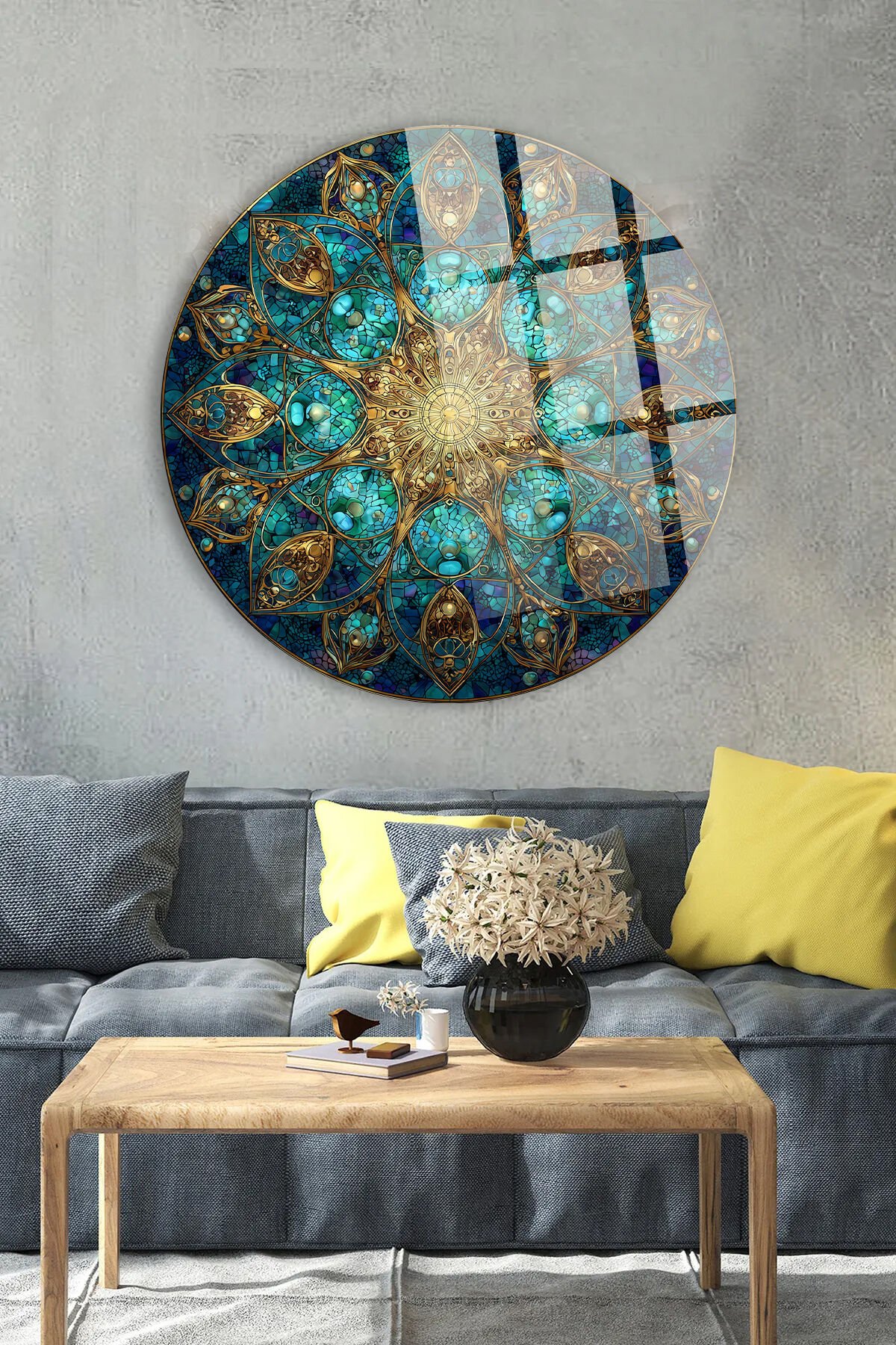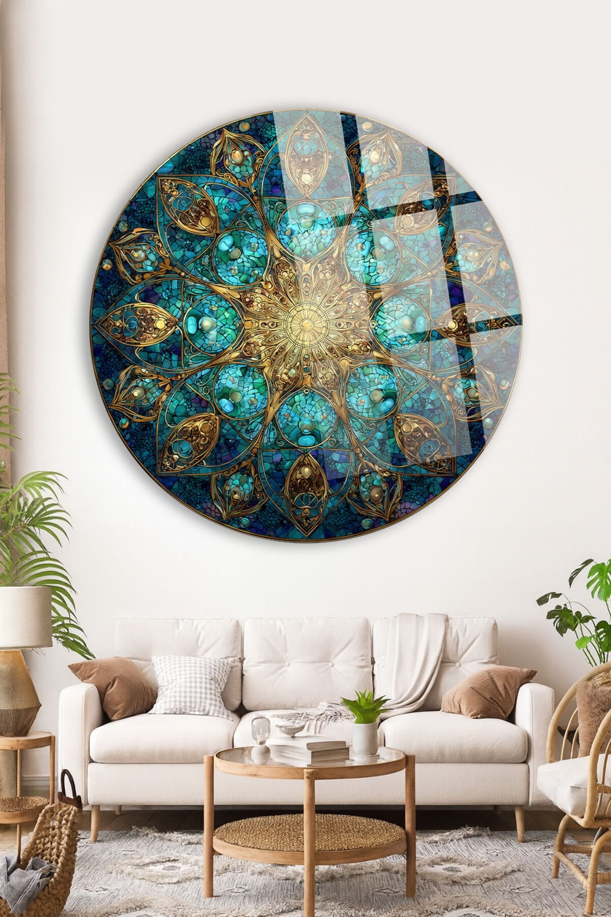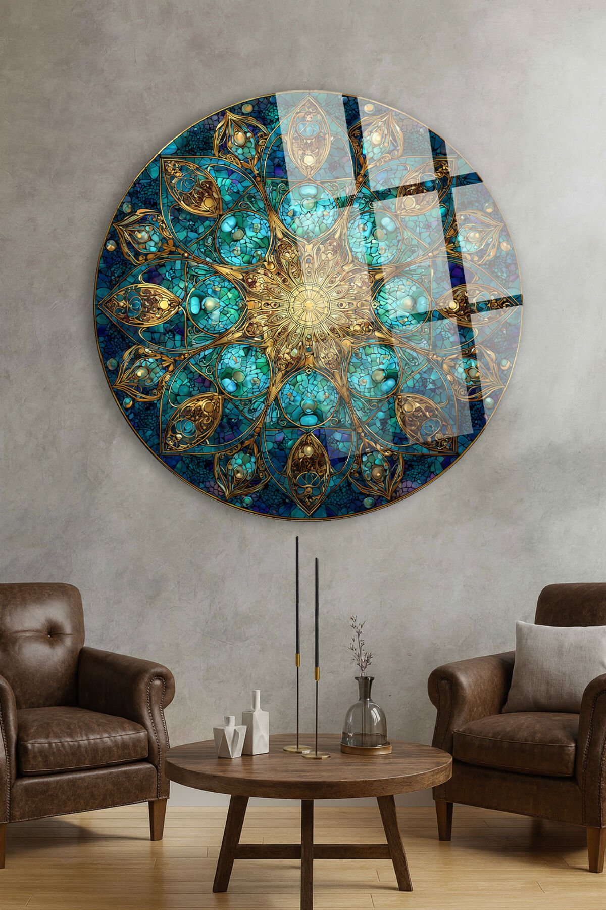 TURKUAZ ZÜMRÜT MOZAİK MANDALA ALTIN İŞLEMELİ DAİRE KIRILMAZ LÜKS CAM TABLO Turkuaz