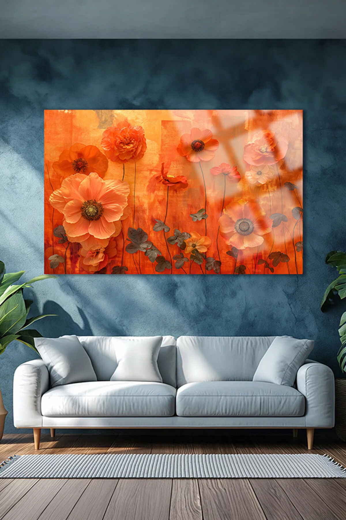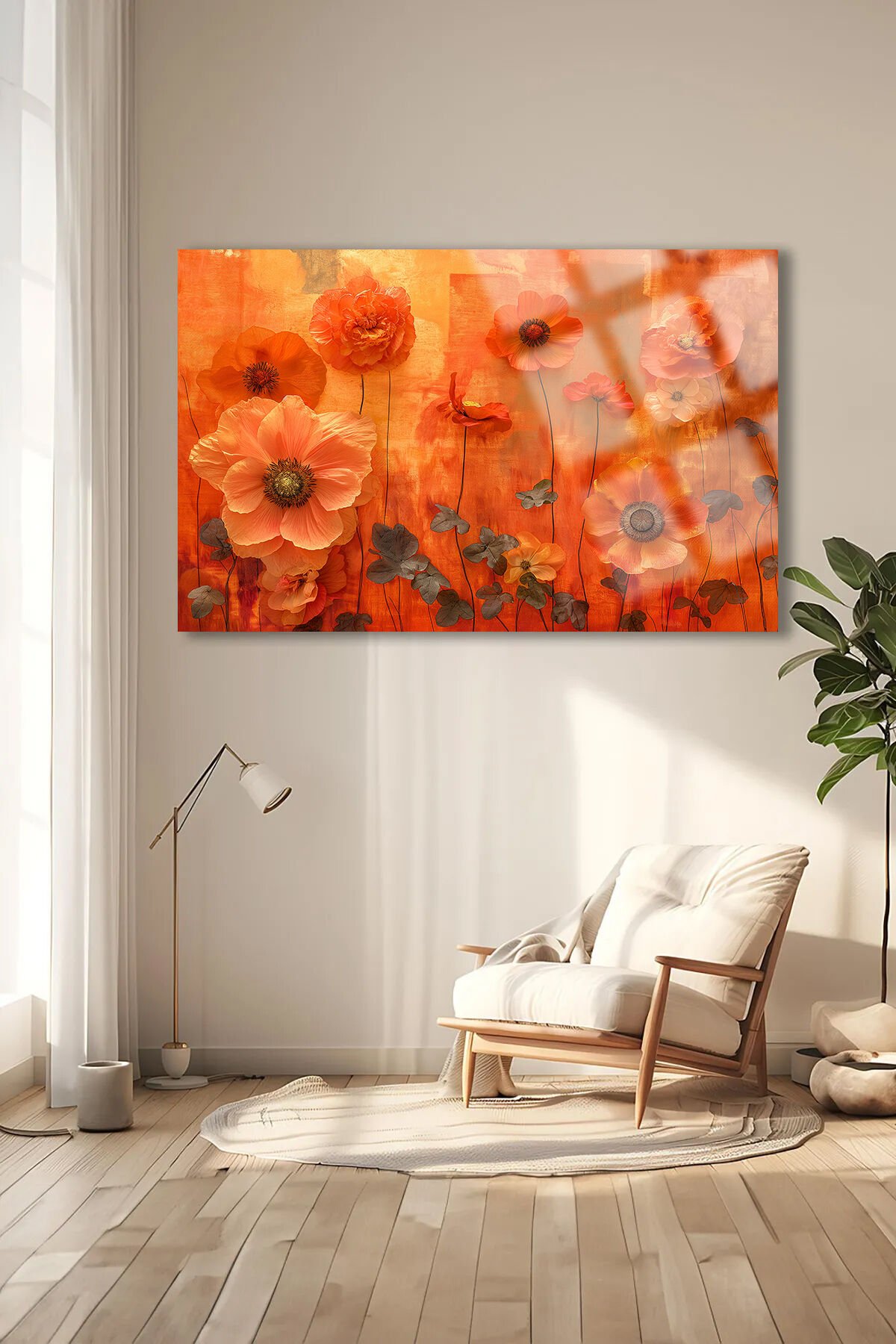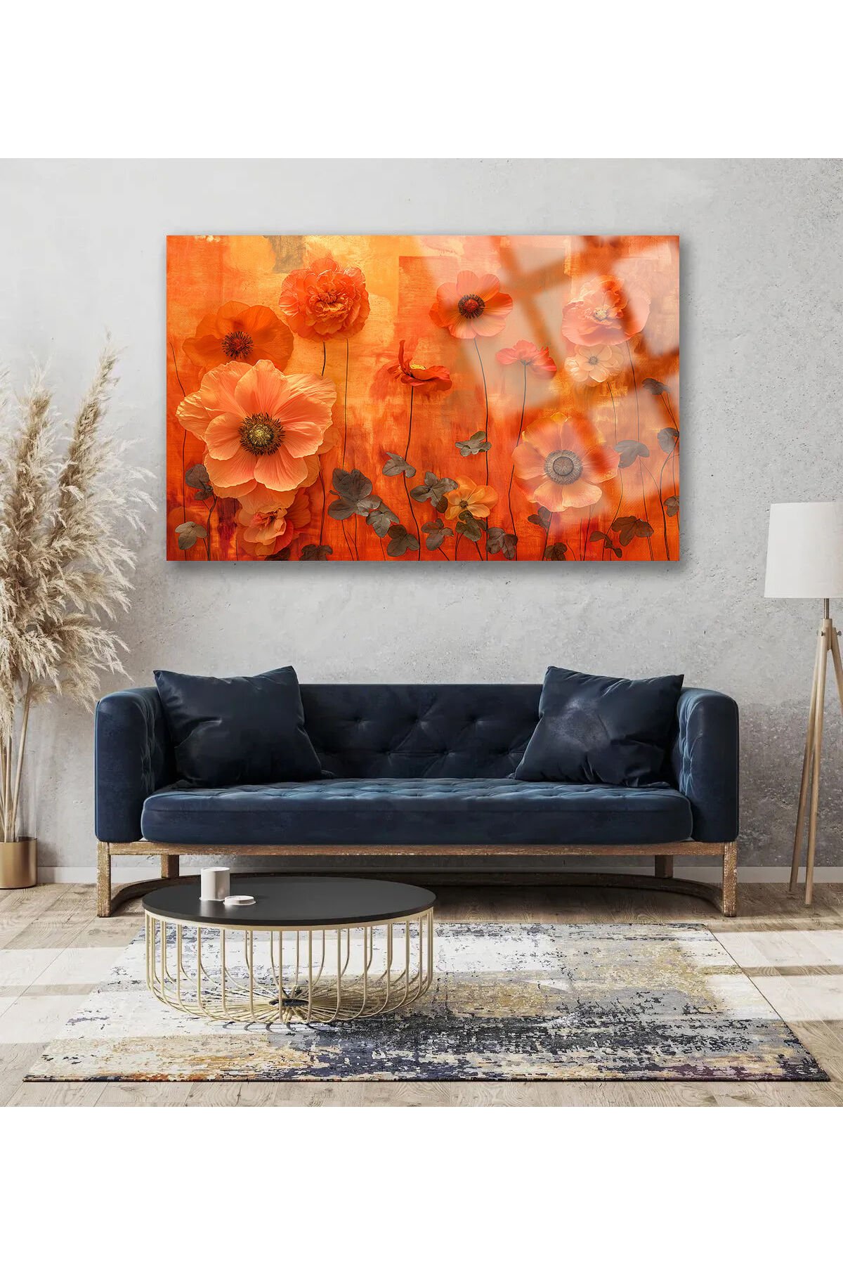 TURUNCU RETRO ÇİÇEKLER YATAY CAM TABLO KIRILMAZ LÜKS CAM TABLO EV HEDİYESİ