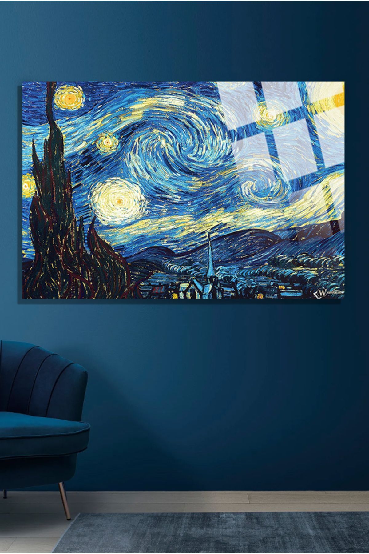 Van Gogh Yıldızlı Gece Kırılmaz Cam Tablo, Ev Ve Ofis Hediyesi Yüksek Çözünürlüklü 4mm Lüks Tablo LACİVERT