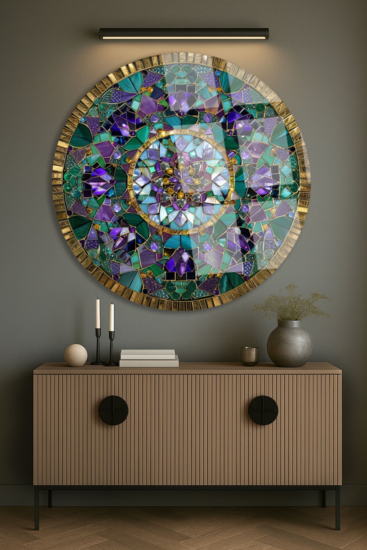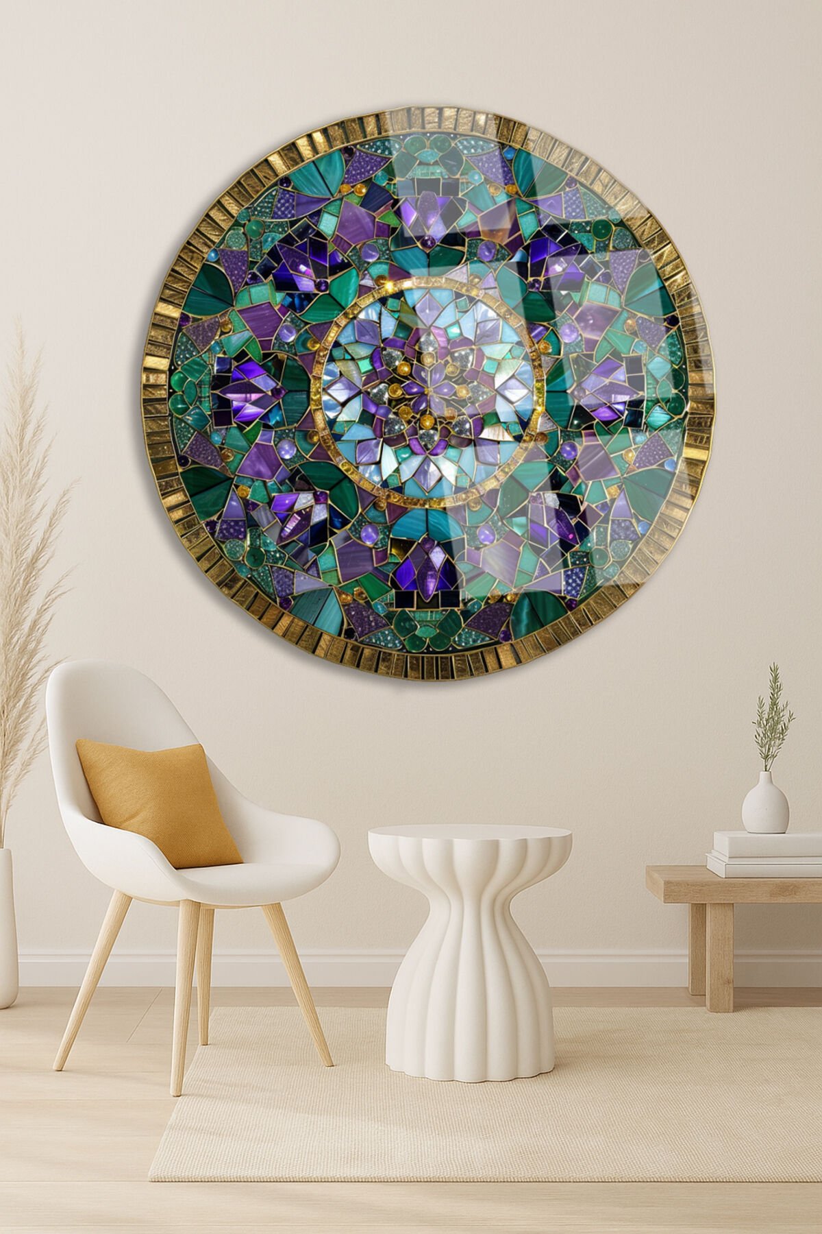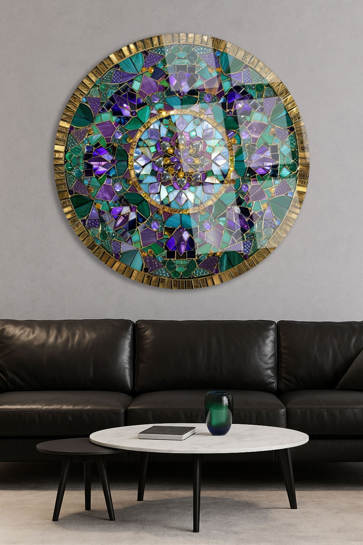Vitray Cam Efektiyle Gösterişli Modern Yuvarlak Kırılmaz Cam Tablo Modern Tablo Lüks Hediye Mor