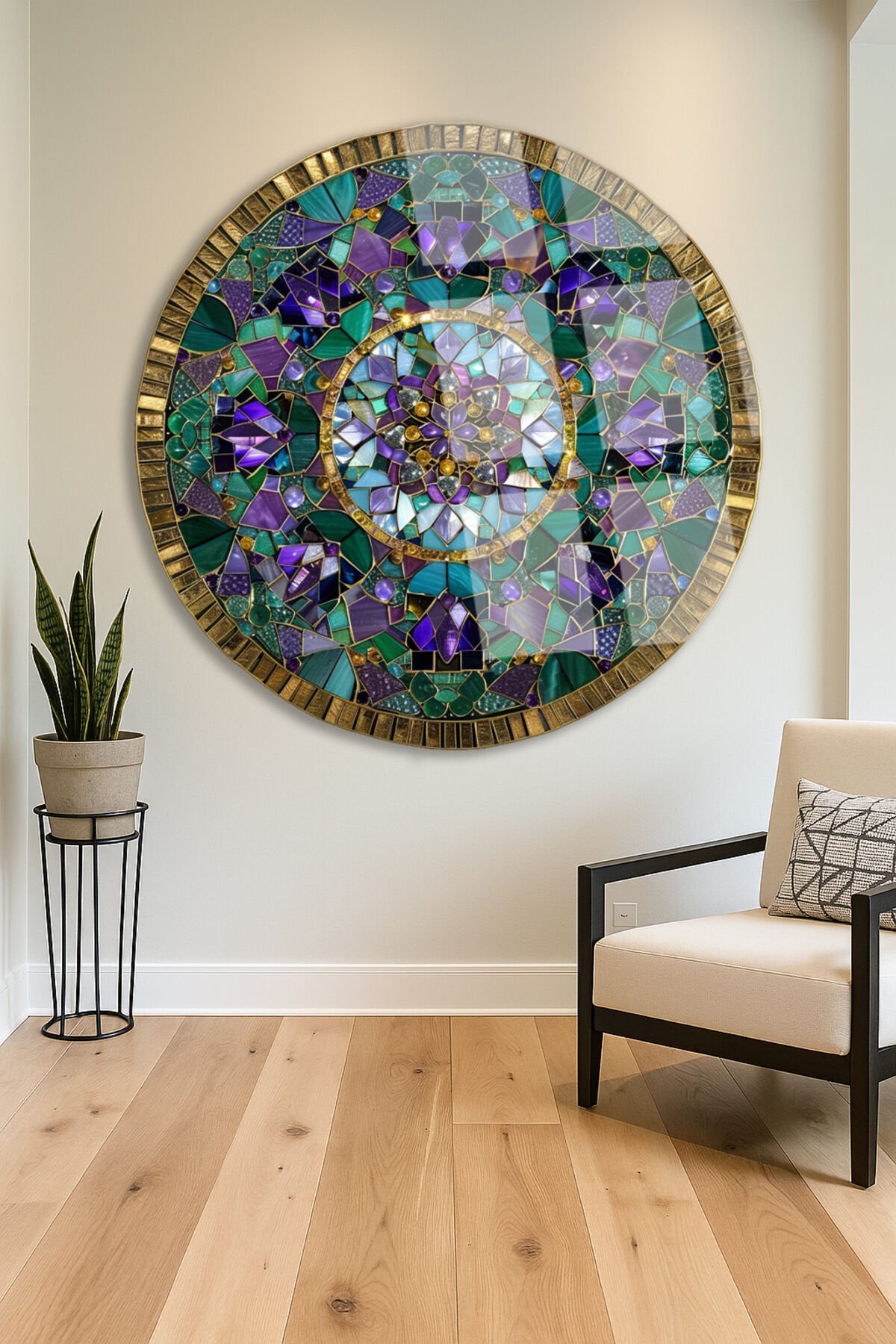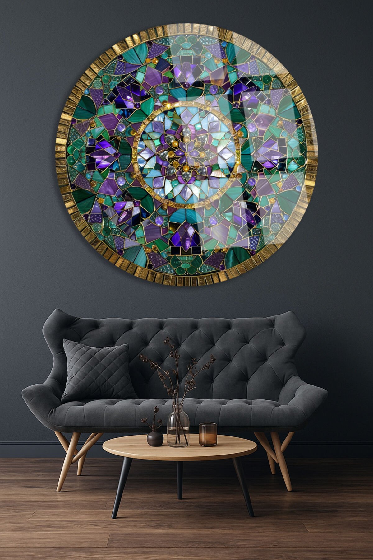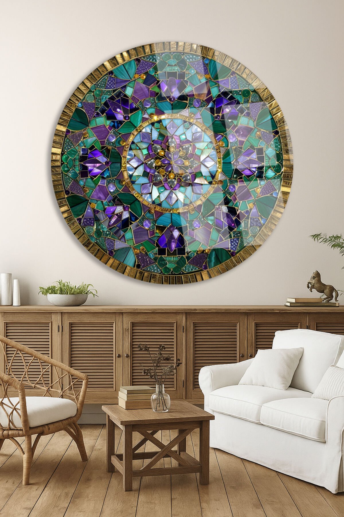 Vitray Cam Efektiyle Gösterişli Modern Yuvarlak Kırılmaz Cam Tablo Modern Tablo Lüks Hediye Mor