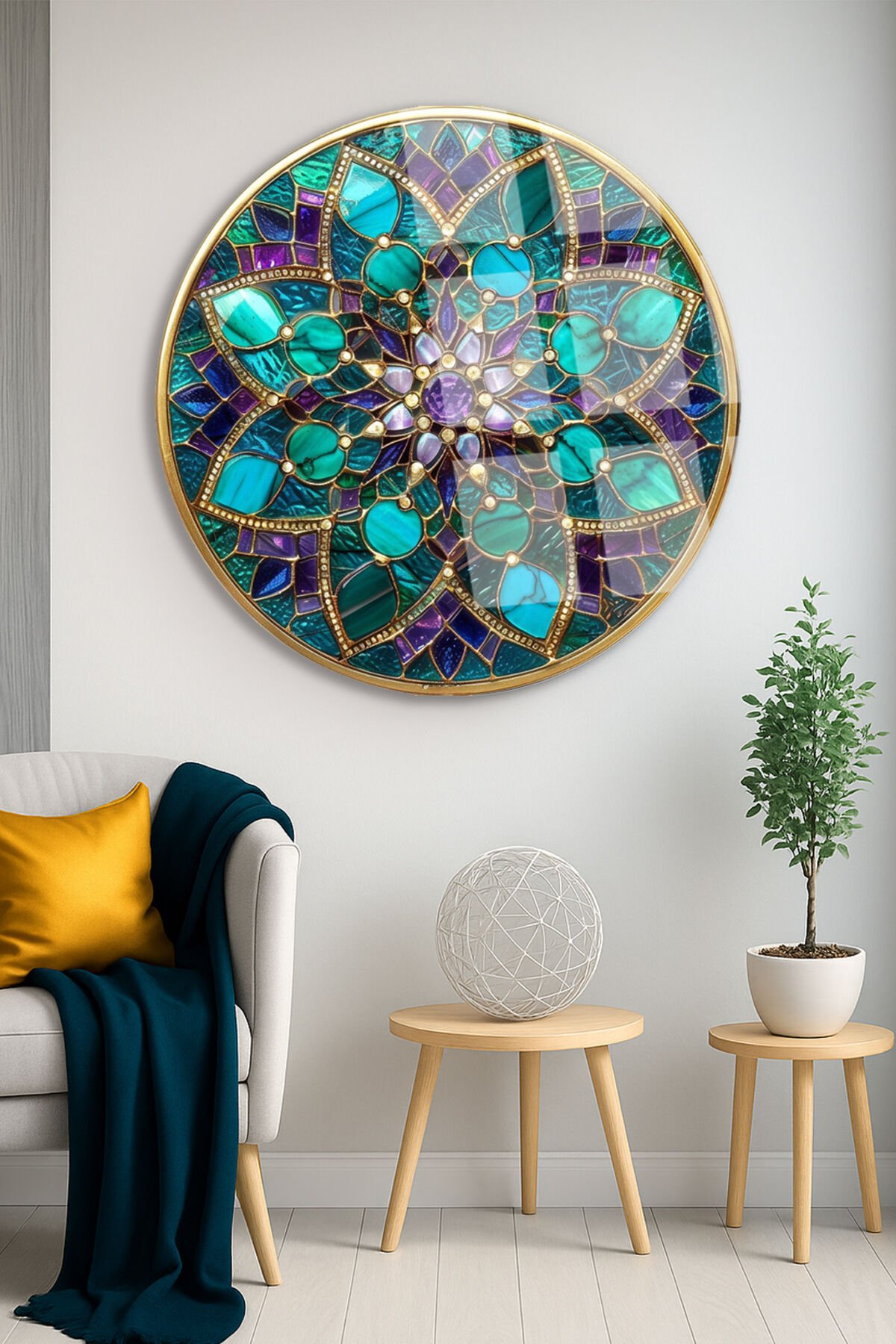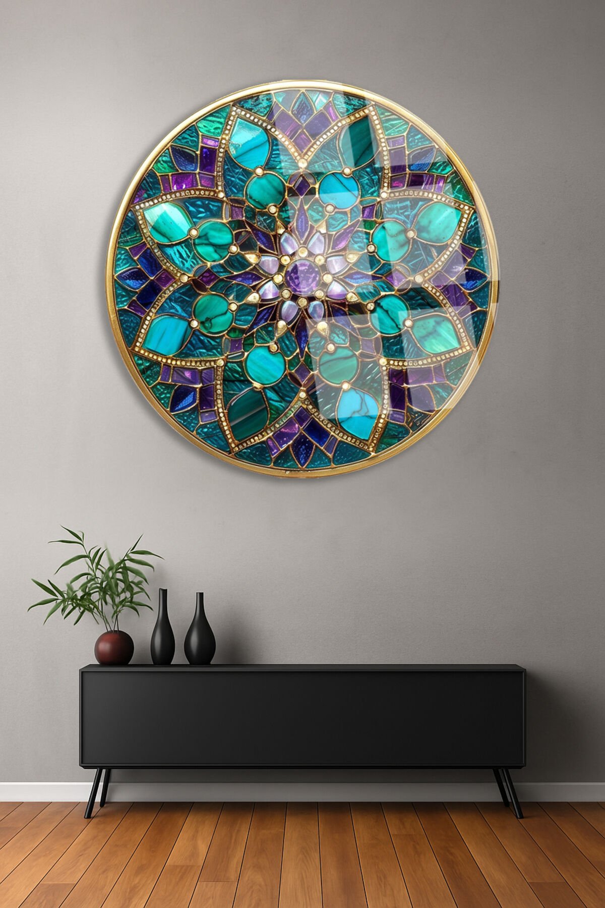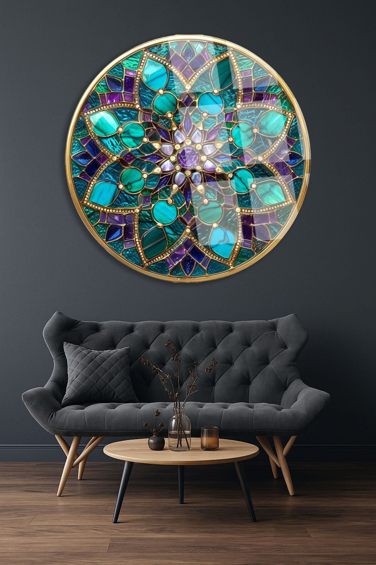 Vitray Tema Altın Çerçeveli Çiçek Motifli Yuvarlak Kırılmaz Cam Tablo Modern Tablo Ev Hediyesi Tablo Turkuaz