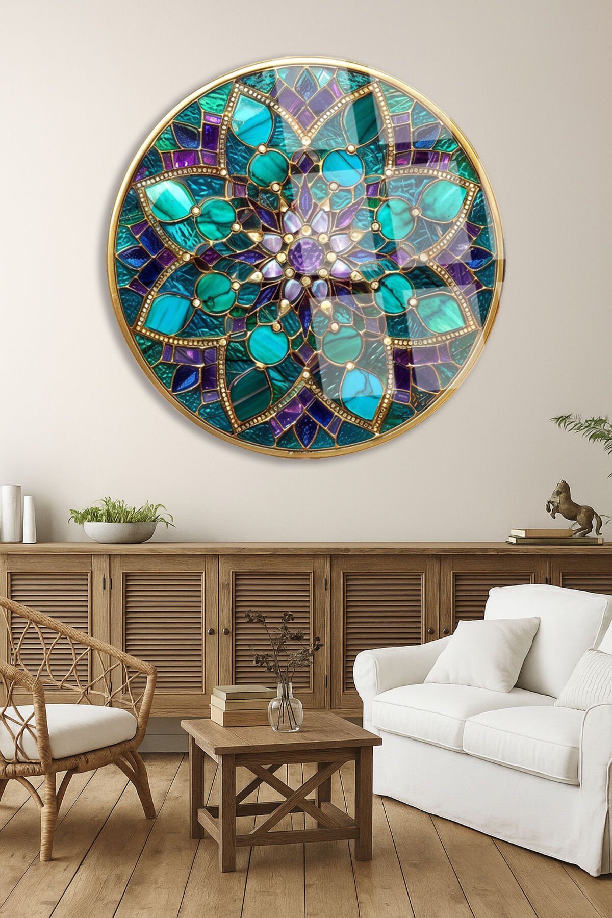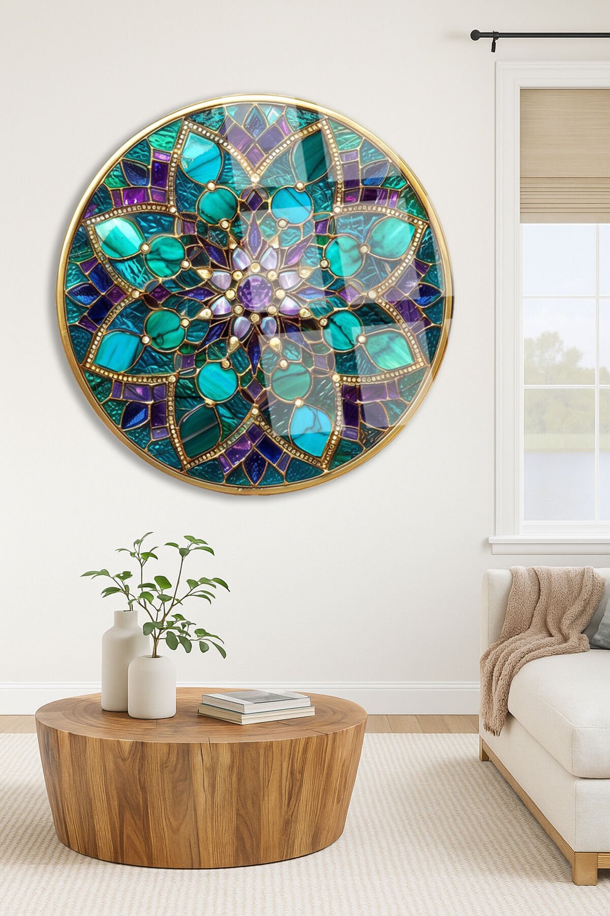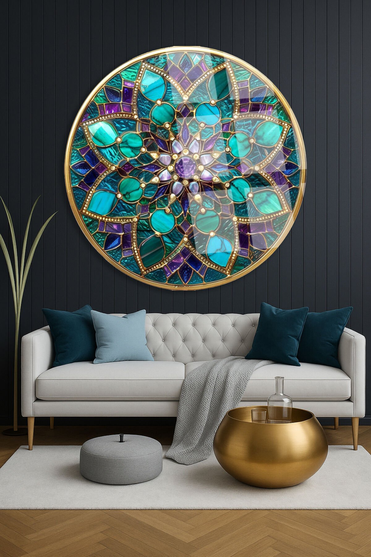 Vitray Tema Altın Çerçeveli Çiçek Motifli Yuvarlak Kırılmaz Cam Tablo Modern Tablo Ev Hediyesi Tablo Turkuaz