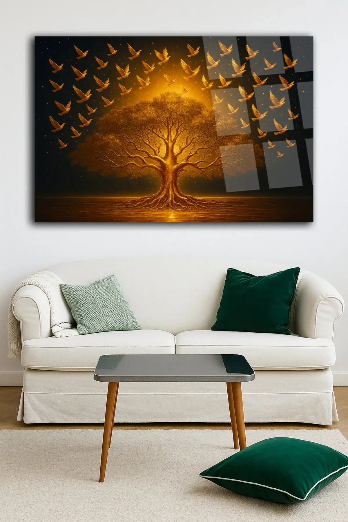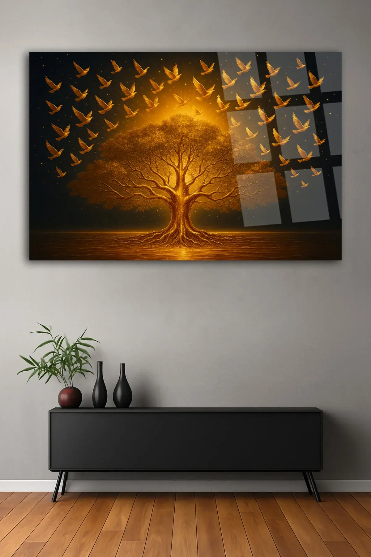 YAŞAM AĞACI VE ALTIN KUŞLAR TABLOSU ŞIK VE LÜKS KIRILMAZ MODERN CAM TABLO İŞ YERİ HEDİYESİ TABLO Turuncu
