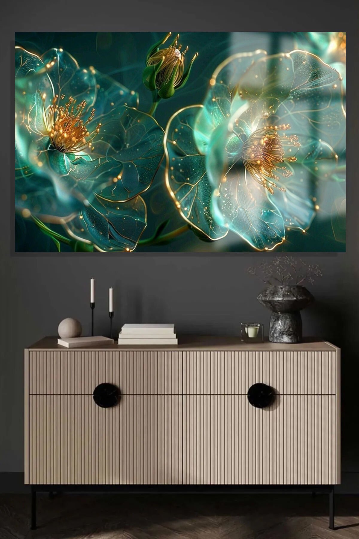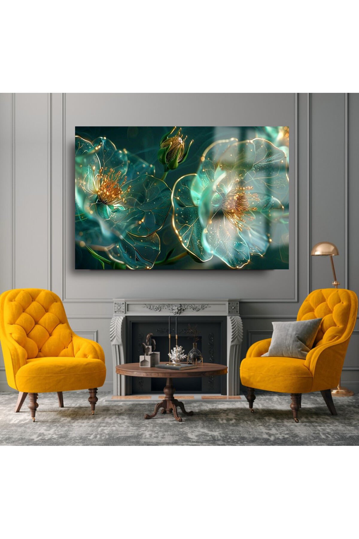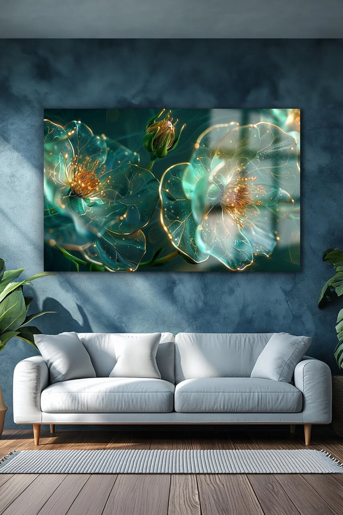 YEŞİL GOLD DETAYLI YATAY ÇİÇEK KIRILMAZ LÜKS CAM TABLO OF İŞ YERİ EV HEDİYESİ CAM TABLO