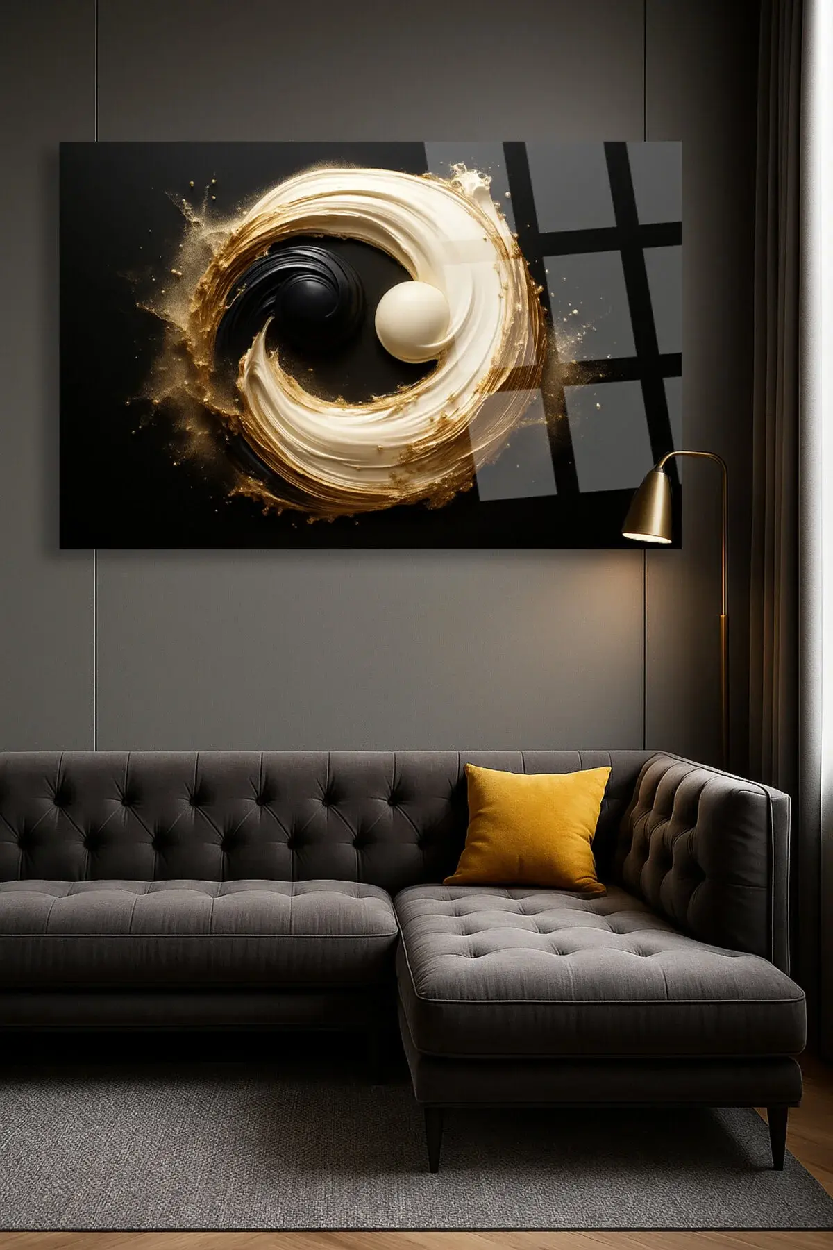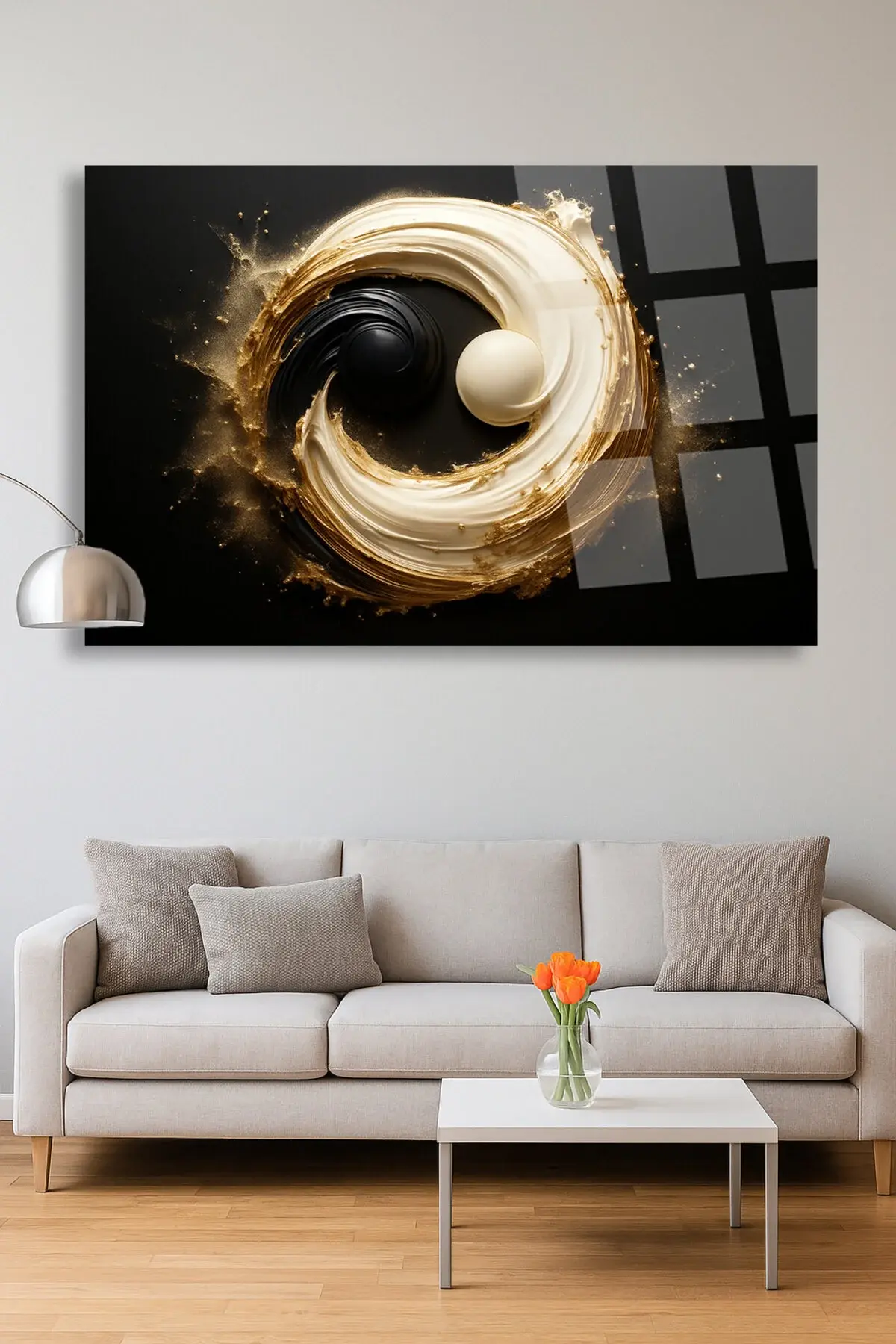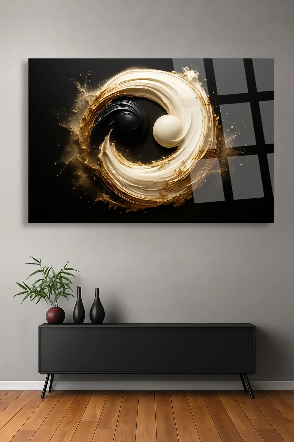 Yin-Yang YATAY HARİKA TASARIM ULRTA CANLI RENKLER KIRILMAZ LÜKS MODERN CAM TABLO EV HEDİYESİ Siyah