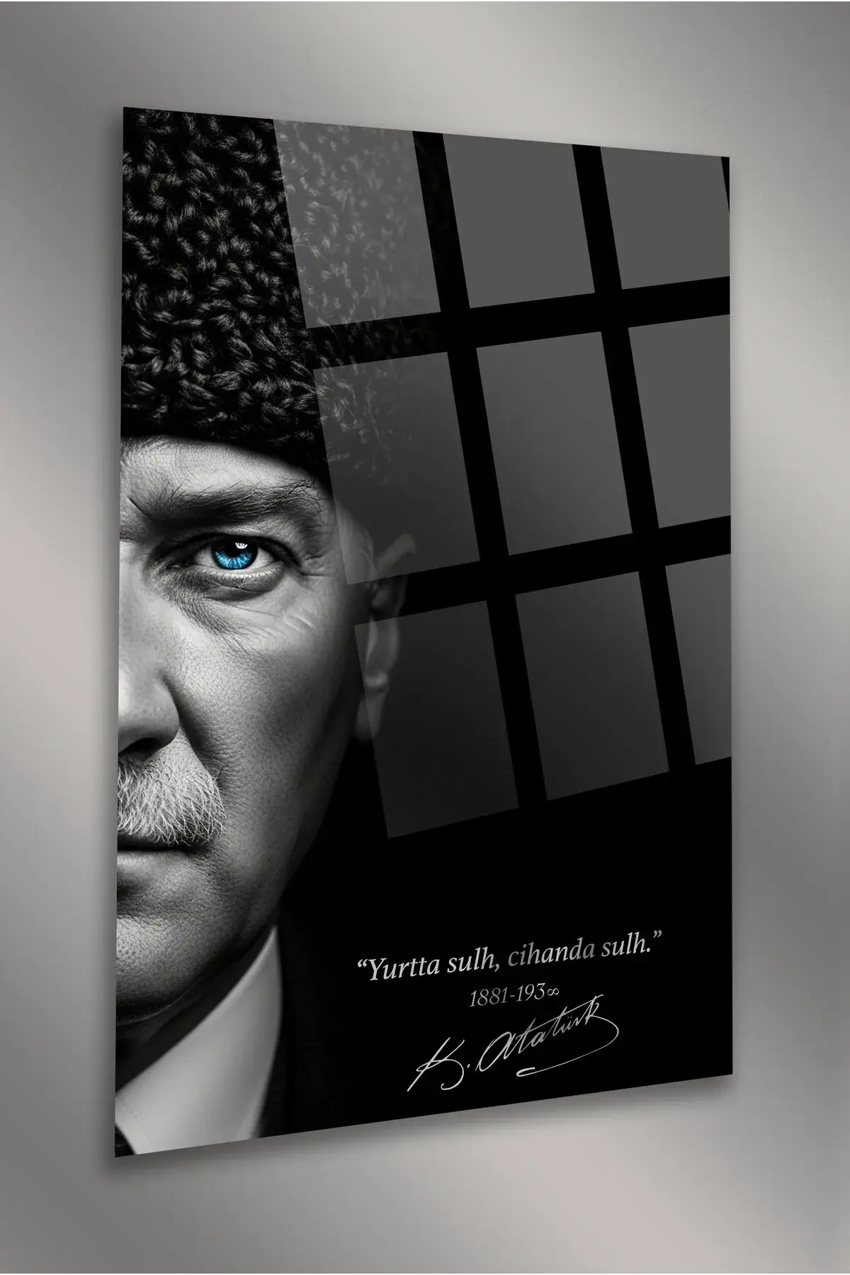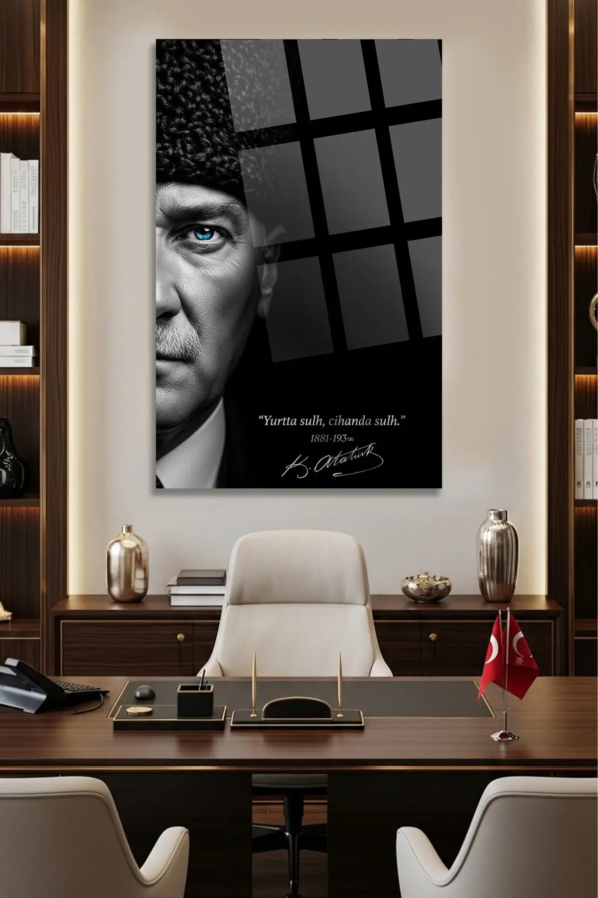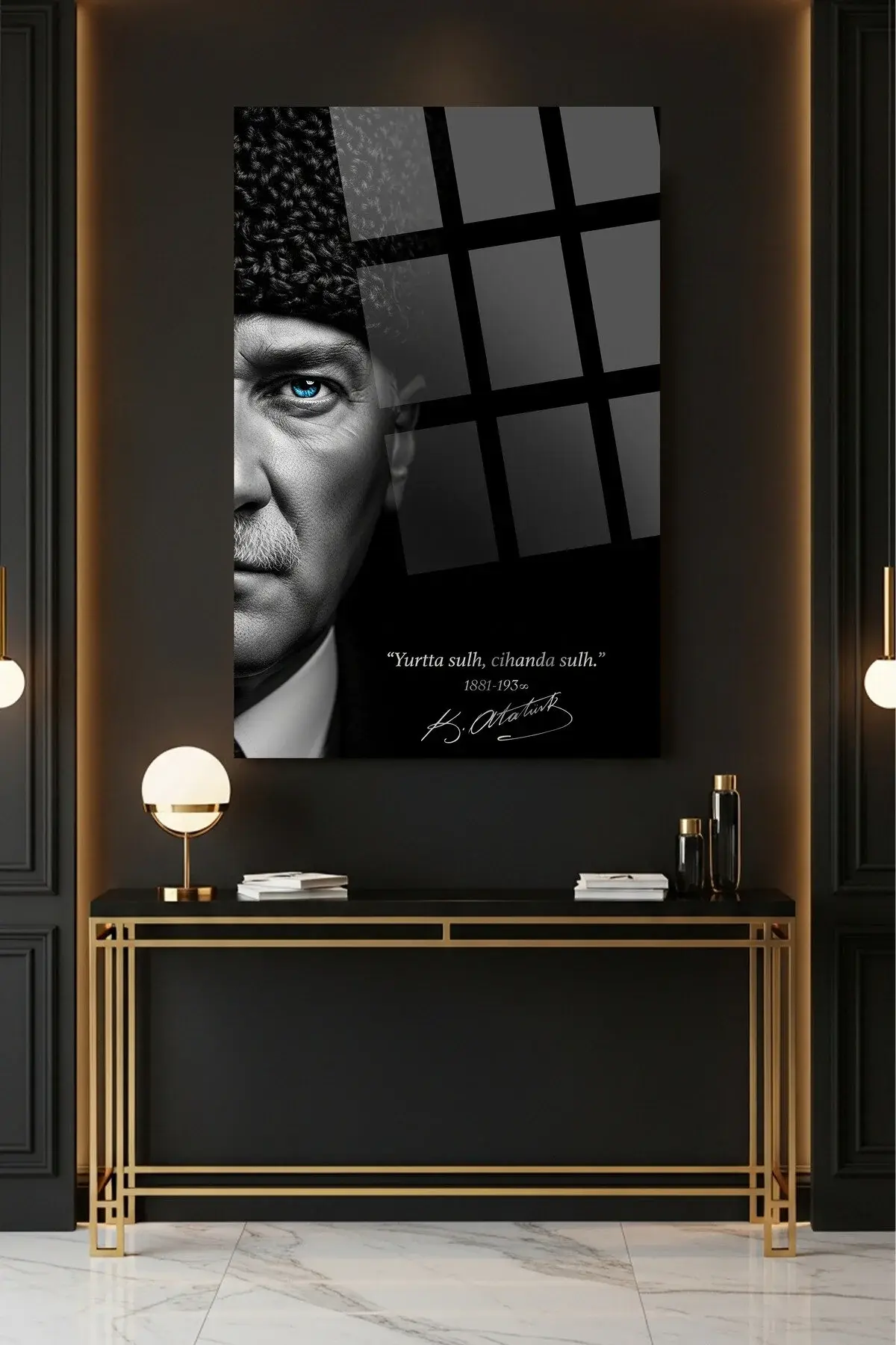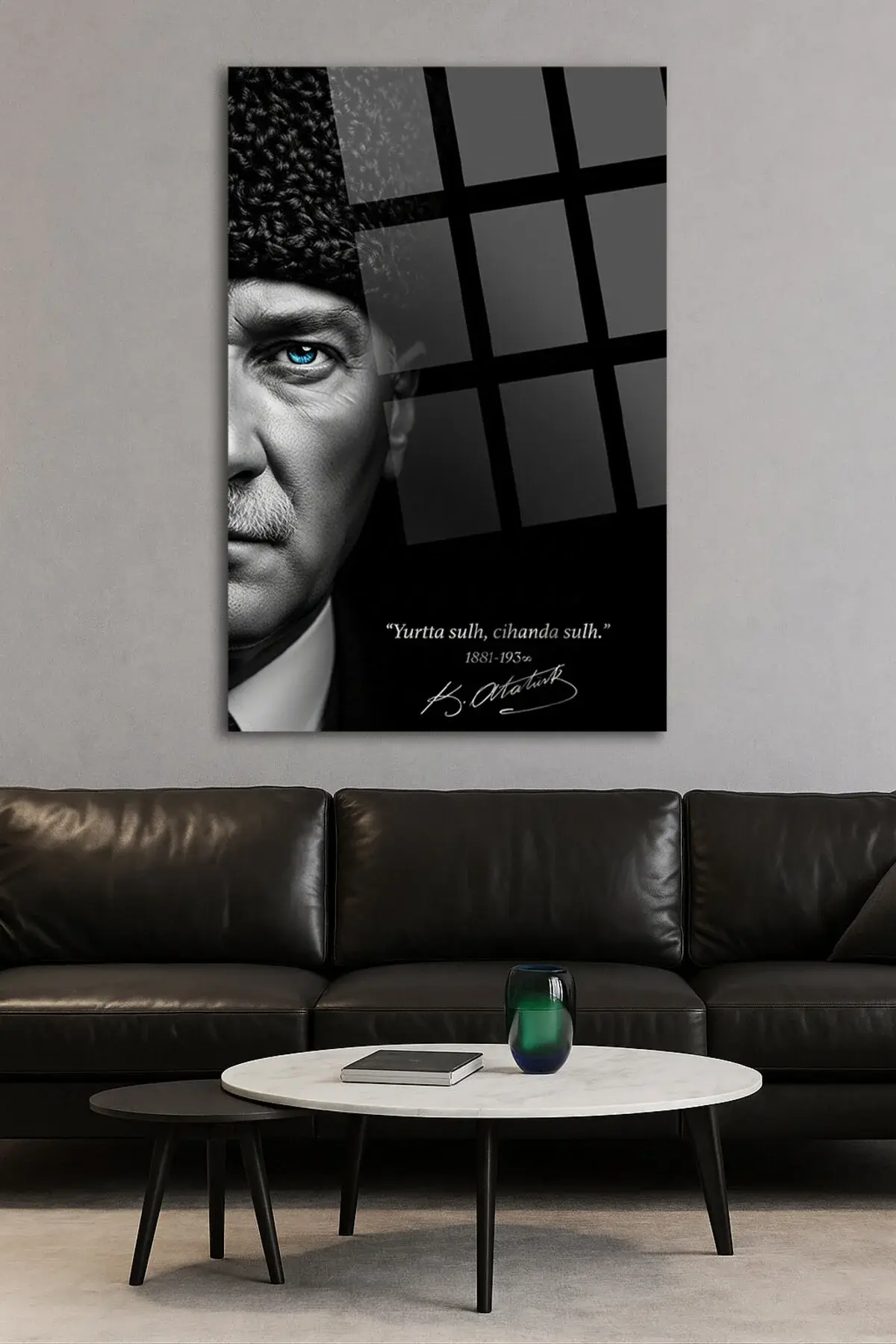 ''Yurtta Sulh, Cihanda Sulh'' ATATÜRK CAM TABLO OFİS HEDİYESİ KIRILMAZ CAM TABLO Siyah