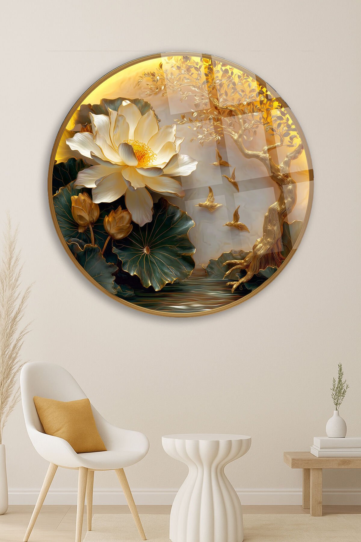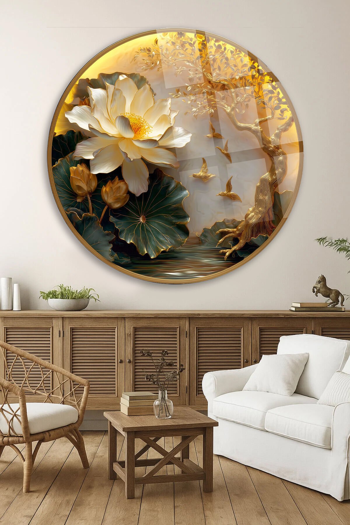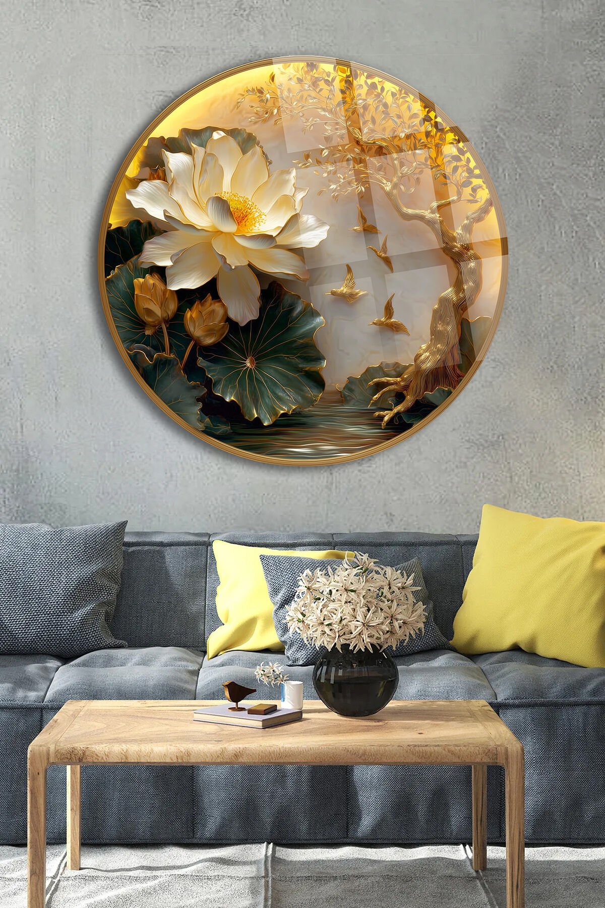 Yuvarlak Kırılmaz Cam Tablo Lüks Altın Lotus ve Hayat Ağacı Şık Salon Duvar Dekoru Bej