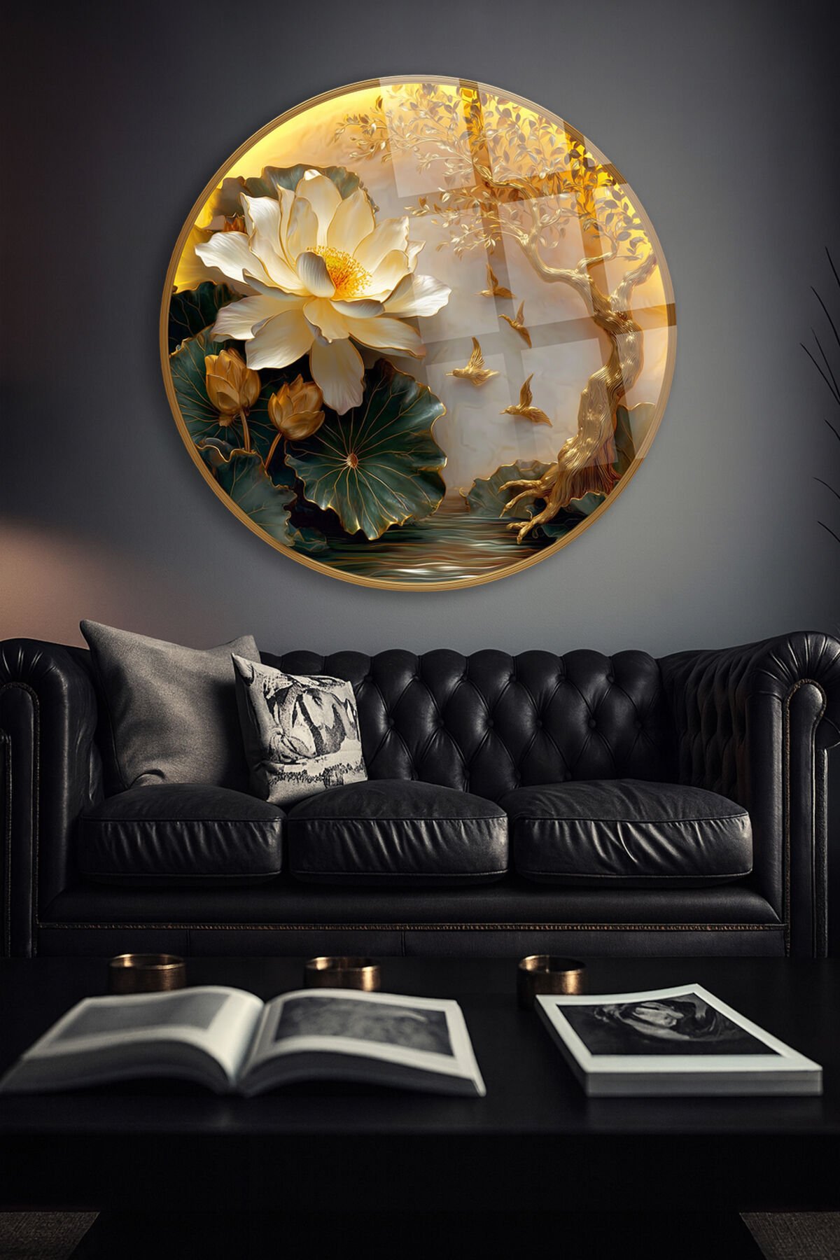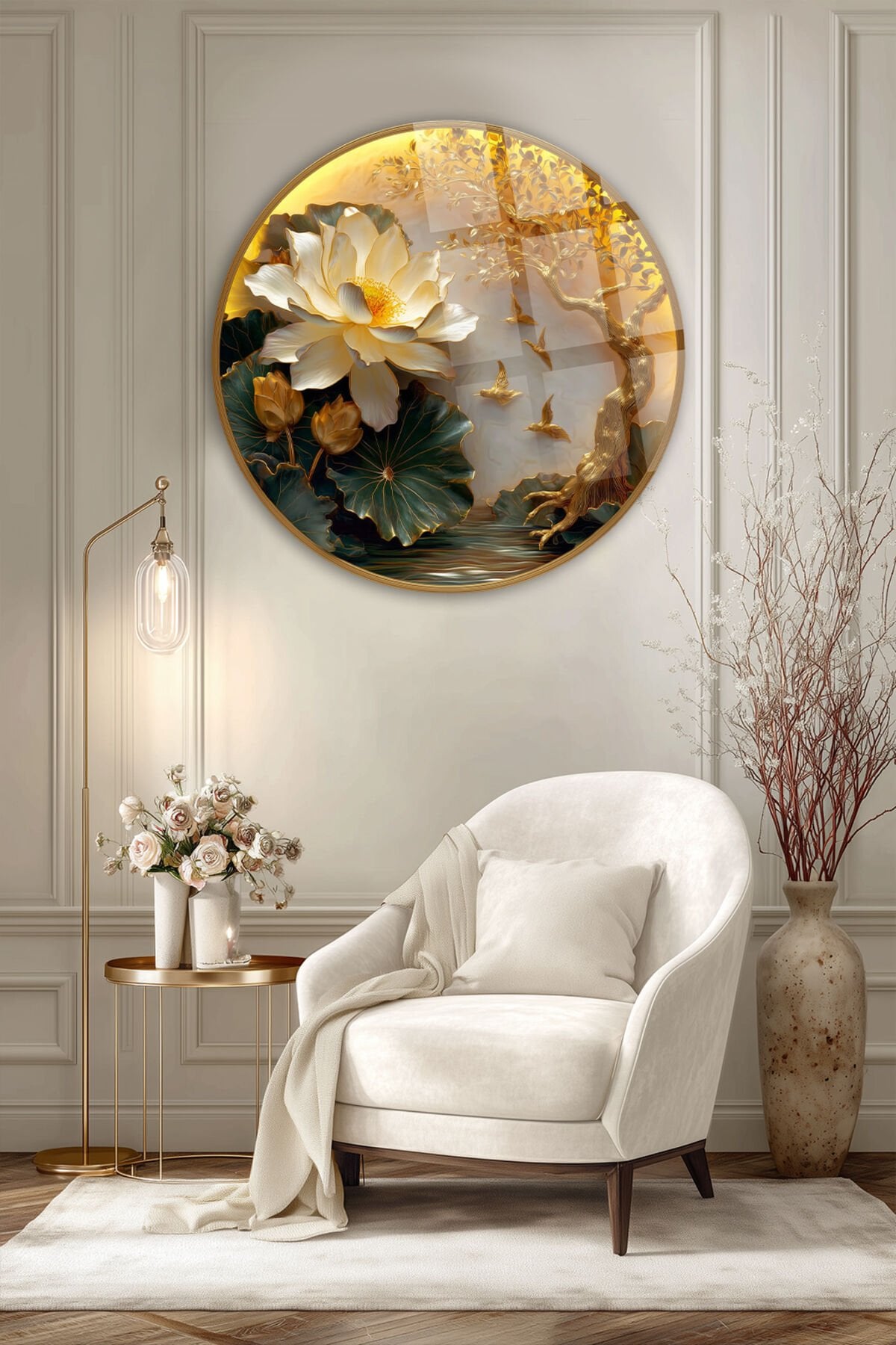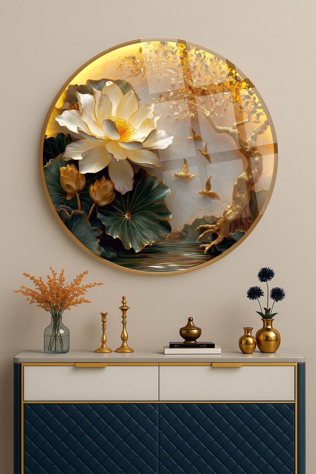 Yuvarlak Kırılmaz Cam Tablo Lüks Altın Lotus ve Hayat Ağacı Şık Salon Duvar Dekoru Bej