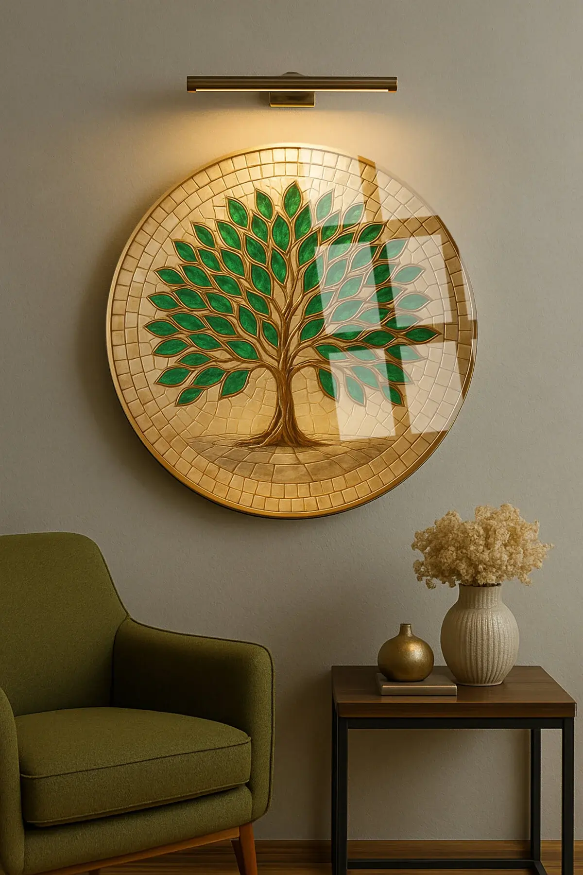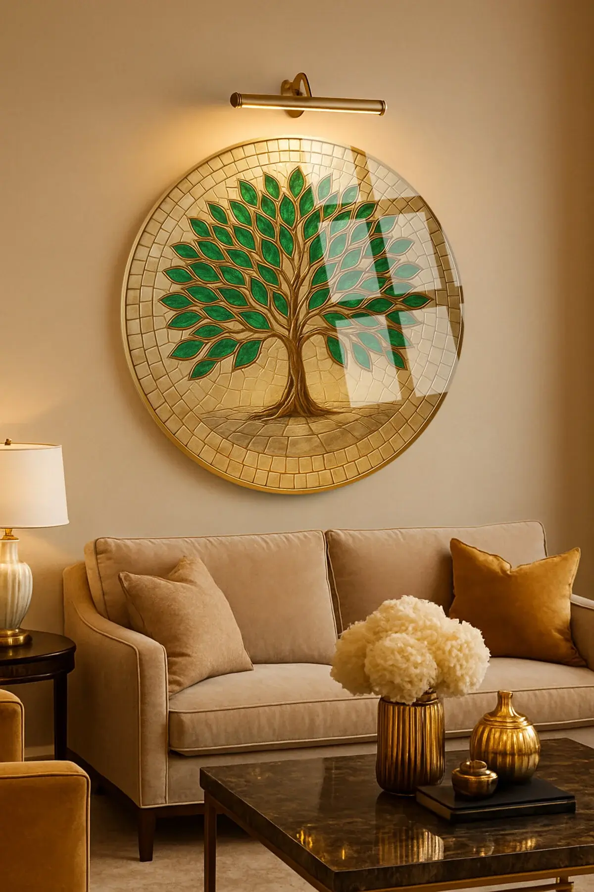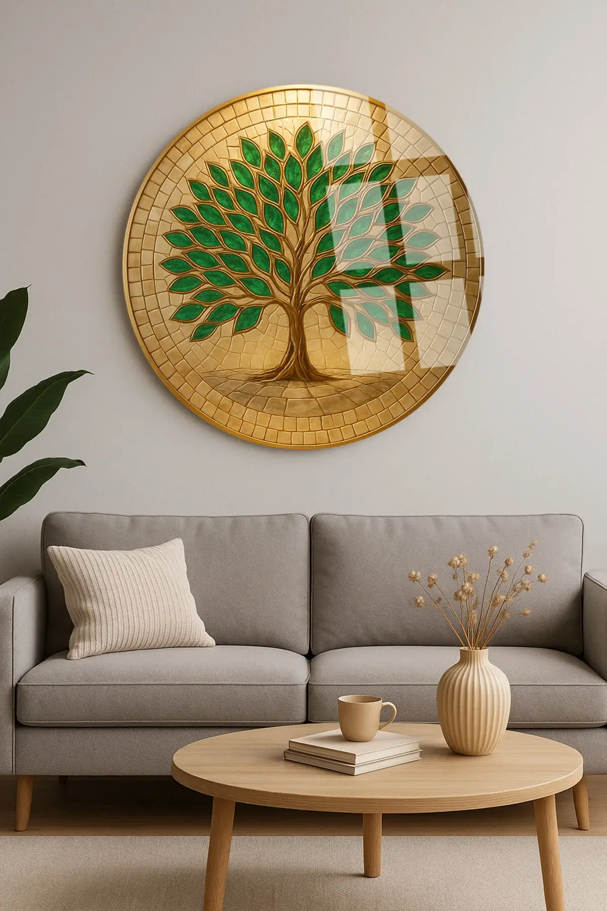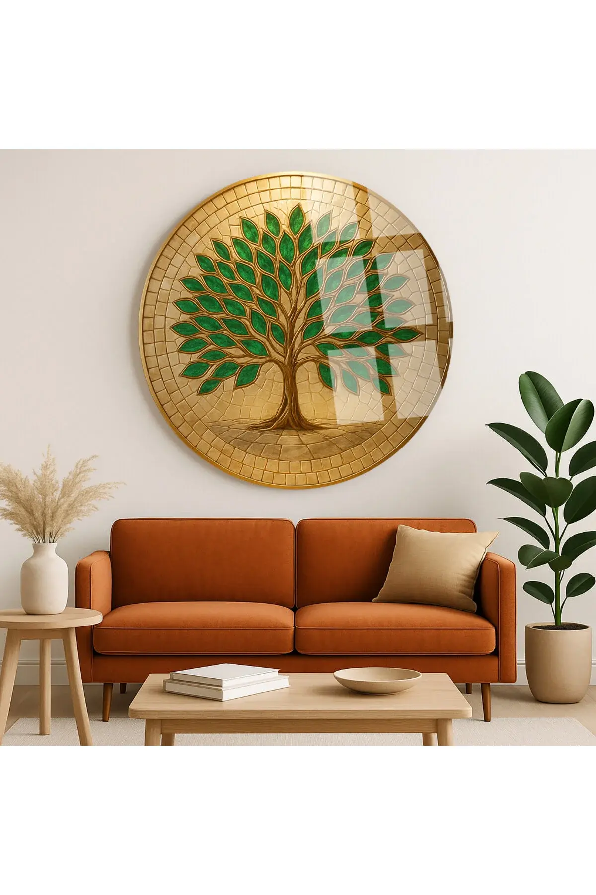 ZÜMRÜT YAPRAKLI MOZAİK AĞAÇ TASARIMI KIRILMAZ YUVARLAK CAM TABLO LÜKS EV HEDİYESİ ULTRA CANLI RENKLİ Krem
